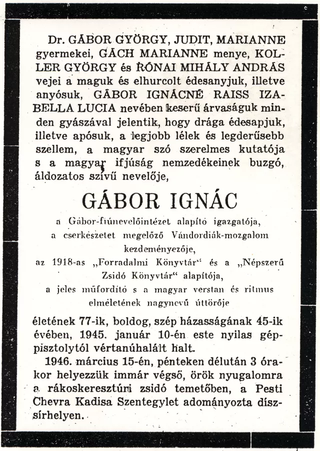 DR. GÁBOR GYÖRGY, JUDIT, MARIANNE gyermekei, GÁCH MARIANNE menye, KOLLER GYÖRGY és RÓNAI MIHÁLY ANDRÁS vejei a maguk és elhurcolt édesanyjuk, illetve anyósuk, GÁBOR IGNÁCNÉ RAISS IZABELLA LUCIA nevében keserű árvaságuk minden gyászával jelentik, hogy drága édesapjuk, illetve apósuk, a legjobb lélek és a legderűsebb szellem, a magyar szó szerelmes kutatója s a magyar ifjúság nemzedékeinek buzgó, áldozatos szívű nevelője,