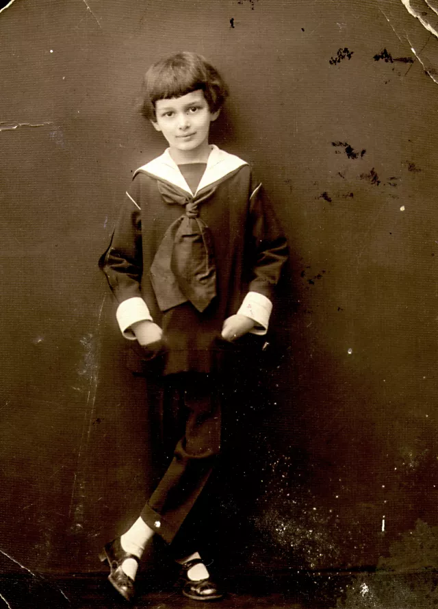 Ez én vagyok, Gunst László, hétéves gyerekként. Nem tudom, milyen alkalomból készült ez a fénykép. A kép Szentesen készült. Az egy kisebb esemény, ha fényképészhez mentünk. Volt a családban is fényképezőgép már akkor, különböző egyéneknek, úgyhogy nem volt azért ez egy világrengető dolog. Matrózruha van rajtam, ez volt akkor az elegancia. Nagyon utáltam, hogy ilyen hosszan kellett hordani a hajamat, mert csúfoltak miatta, hogy hosszú haj, rövid ész. Anyámnak volt ez mániája, de én utólag jöttem csak rá, hogy az Évike, az én nővérkém, aki még az én születésem előtt meghalt, és anyám valahogy úgy látszik, az ő pótlását vélte bennem. Legyen egy kislány. Nem tudok más okot, mert más fiúknak nem volt ilyen hajuk.