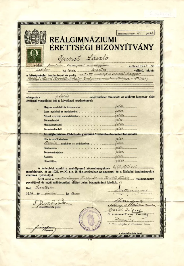 Ez az én érettségi bizonyítvánom. 1934-ből való bizonyítvány, és Szentesen állították ki.