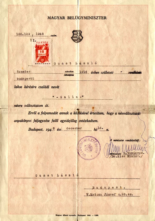 Ez a névmagyarosításomról egy igazolás. Itt lehet látni, hogy 1948-ban változtattam meg a vezetéknevemet Gunstról Gallára. A dokumentumot Budapesten állították ki.