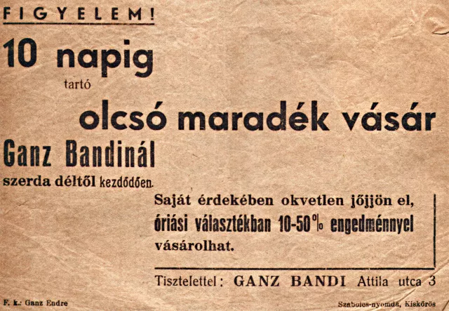 Gárdonyi Endréné kereskedő férjének reklámcédulája