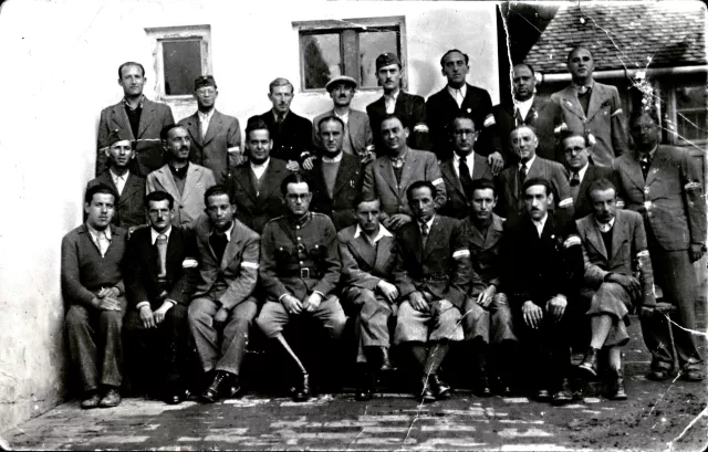 Ezen a fényképen apám [Gáti (Grósz) Dániel] jobboldalt az első legfelül, a munkaszolgálatos társaival. Karcagon készülhetett a fénykép, mert innen vitték el apámat a többi zsidó férfival együtt.