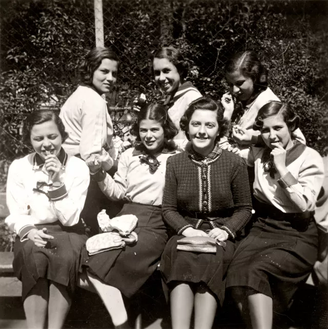Ez a kép is Visegrádon készült. A nyarat mindig Visegrádon töltöttük. Itt kint volt nálunk az egész osztály. Azt mondom, hogy az osztály, de ez itt mind zsidó kislány. Pedig ott volt keresztény is az osztályban. Ez a kép egy iskolai kiránduláson volt. Az iskola Visegrádra kirándult, és akkor az anyuka meg az apuka azt mondta, hogy kimegy a szakácsnő, és csinál fagylaltot meg szendvicseket, és akkor lássuk vendégül az egész osztályt.