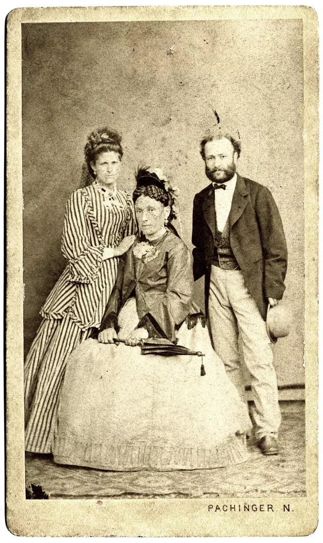 Ők az anyai dédszüleim, Glück Adolf és Grad Franciska. Az előttük ülő nő egy rokon. A tizenkilencedik században a Glück és főleg a Grad család igen kiterjedt volt. Egy-két generációval később a rokonok már nem mind ismerték egymást. Anyám a második világháború után úgy szerzett tudomást egy távoli unokatestvérének a létezéséről, hogy egy közös rokon, Kohn Edith érdeklődött róla New Yorkból. Attól kezdve tartottuk a rokoni, családi kapcsolatot a Budapesten élő Kohn/Kálmán Terézzel, bár a pontos rokonsági fokot soha nem sikerült megállapítani.