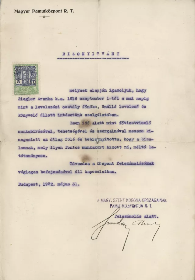 Édesanyám munkaviszonyának megszűnését közli ez a bizonyítvány 1922-ből. Ez a Pamuközpont Rt. végleges felszámolásával van kapcsolatban. A bizonyítvány igen pozitívan jellemzi a munkáját.