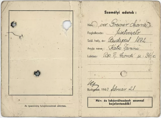 Greiner Mórné szakszervezeti igazolványa (1940)