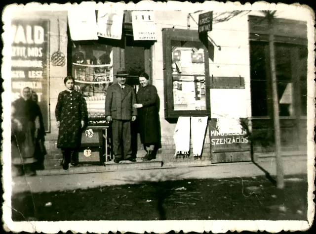 Ezen a fényképen az apámnak a testvére, [Grósz] Miklós bácsi van, mellette, aki átkarolja őt, az a felesége. A fénykép az apám üzlete előtt készült. A másik két személyt nem ismerem. Jobbról az első talán anyám cselédje, mellette pedig talán Kelemen Erzsike, aki az apám üzletében volt alkalmazott.