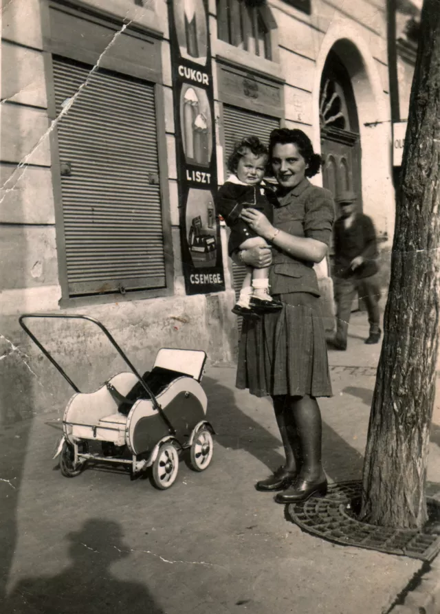 A képen Grünstein Helén, a férjem első felesége látható a kisfiával, és azt írja a fénykép hátán: "Emlékül apukának Anyu és Ernőke". 1942-ben volt csinálva, Marosvásárhelyen, az  utcán. Úgy látszik, valami élelmiszerféle üzlet előtt lehetett. Látszik, hogy ki van írva: "Cukor, liszt…". A  férjem munkaszolgálatos volt Nagybányán, és akkor küldték [Máramaros]Szigetre. Az uram nagyon őrizte, és vigyázott ezekre a képekre, amiken a volt családja volt.