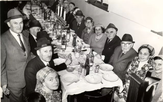 Ez húsvétkor [Pészah] volt, szédereste. Nagyon sokan voltak egy-egy ilyen széderestén akkoriban. Jobboldalt az első a sógornőm, Marcinak a harmadik felesége, mellette én vagyok, utánam pedig a negyedik személy, a szemüveges hölgy a mostohaanyám.  Baloldalt Huszár Bözsi, Grünstein Jóska, az uram, és aki áll, az a sógorom, Grünstein Marci. Sokszor mondta, hogy "Ha köszönnek, fogadom, de tudom, hogy nem nekem szólt, hanem az öcsémnek, Jóskának", mert nagyon hasonlítottak.