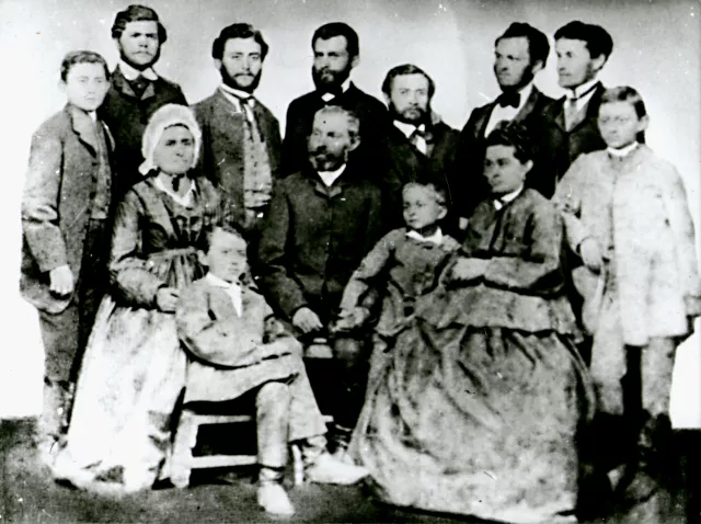 Ez egy nagyon-nagyon régi kép. Nem is tudom, miképp maradhatott meg majd másfél évszázad után is. Nem tudom biztosan, hol és mikor készült a kép. Az apai dédszüleim láthatóak rajta 11 gyermekükkel. A nagyapám, Gunst Lipót a második jobbról az álló sorban. Megismerem még a képen a dédszülőkön kívül Berti bácsit, akit Bertalannak hívtak. Ő a dédpapa mellett álló kisfiú.