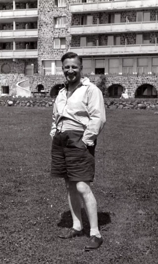 Apám a galyatetői nagyszálló előtt 1948-ban. Akkor osztották először az élmunkás kitüntetéseket, ami egy gyalyatetői egyszemélyes, kéthetes beutalóval járt együtt. [Élmunkások: 1948. március 15-én hirdették meg először -- szovjet mintára -- az első országos munkaversenyt, és az itt élen járó munkásoknak adományozták az ?élmunkás? kitüntető címet. A főként a szakmunkások közül kikerülő munkáselit a káderutánpótlást szolgálta. A címmel különféle kedvezmények is jártak (üdülés, vásárlási lehetőség, olykor lakáskiutalás). A munkaversenyben ezt követően áttértek a sztahanovista mozgalomra (ez a mozgalom 1935-ben indult a Szovjetunióban a termelés növelésére). Magyarországon először Sztálin 70. születésnapján, 1949-ben hirdették meg. 1954-ben megszűnt a mozgalom, 1956-ban a címet is eltörölték. -- A szerk.]