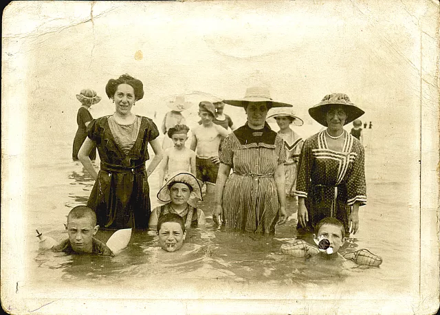 Ezek az anyósom testvérei. A bal oldalon álló a Jeta néni. A jobb oldali szerintem a Giza, a középső pedig a Lina. A kisfiú a bal oldalon a férjem. Azt hiszem, hogy ez a Balaton, és a férjem olyan 7-8 éves lehet, tehát valamikor az 1900-as években készülhetett a fotó.