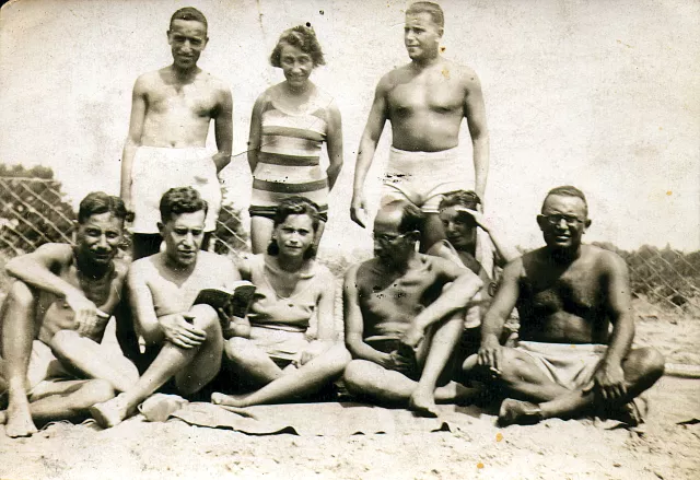 Ezen van, akit ismerek, de nem mindenkit. Csónakkiránduláson vagyunk, lehet, hogy Göd, de lehet, hogy Vác. 1930 körül készülhetett a kép. Balra lent a férjem, Hahn Imre, mellette Oblath Andor, az unokatestvérem, mellette én, fent jobbra Oblath Jenő, Andor testvére, a többiek barátok.