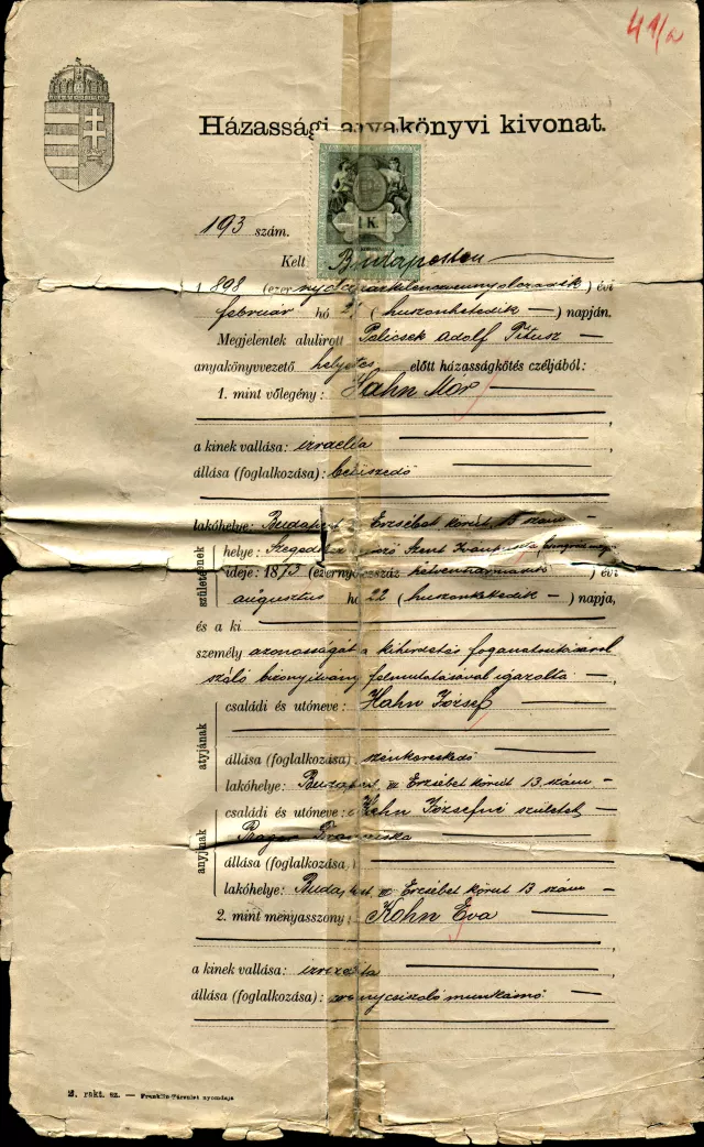A férjem édesapja, Hahn Mór, azt hiszem, hogy Szeged környékén született, Szentiványpusztában, 1873-ban. És 1872-ben született a felesége, a Kohn Éva Nagypeszeken. Lánykorában, ezt csak úgy hallomásból tudom, állítólag gyémántcsiszoló volt, de semmi többet nem tudok róla. Az Imre apja nyomdász volt, és szocialista. A férjem Budapesten született 1899-ben. Sokkal idősebb volt, mint én, és az édesapja 1914-ben meghalt. Az édesanyja nem ment férjhez újra.