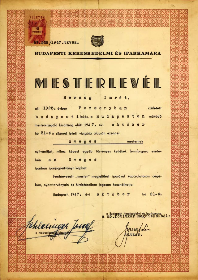 aki 1923. évben Pozsonyban született budapesti lakós, a Budapesten működő mestervizsgáló bizottság előtt 1947. évi október hó 21-én sikerrel letett vizsgája alapján ezennel
