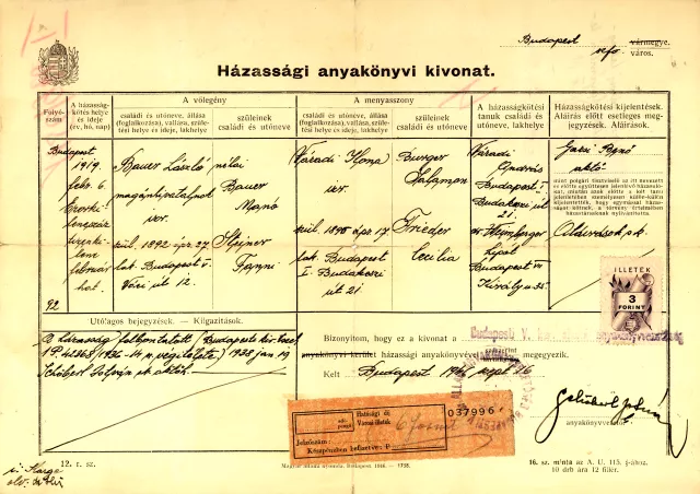 Bauer László és Váradi Ilona házassági anyakönyvi kivonatának másolata