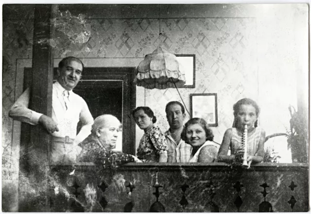 Ez egy Budakeszi hétvégén készült 1938-ban. Jobbra vagyok én, ez a kép július 24-e után készülhetett frissiben. Mert ezt a trombitát a születésnapomra kaptam, azért fújom itt ilyen vadul. Mellettem Ledő Marika, anyám legjobb barátnője, aztán apa, anya, Anna nagymama, aki itt az oszlopot átöleli, az dr. Szalai Imre ügyvéd, barát, akinek a barátnője Ledő Mari. Ennek a dr. Szalai Imre ügyvédnek ügyvédi irodája volt, ugyanott a Hegedűs Gyula utca 16-ban, ahol mi laktunk. Apámék legszűkebb baráti társaságához tartozott.