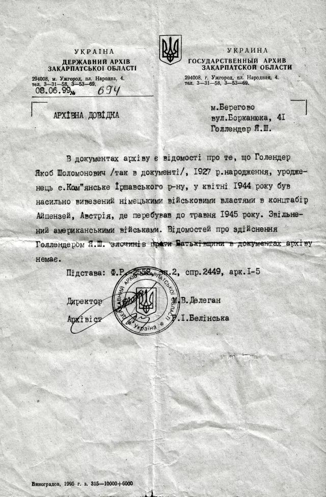 Ez a dokumentum az én nevemre van kiállítva. Azt bizonyítja, hogy az ebenseei koncentrációs táborban voltam fogva tartva.