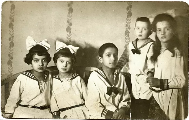 Ezek anyám és testvérei gyerekkorukban, a Visegrádi utcában, ahol nagyanyámék laktak. Balról jobbra: Beke Lenke, Beke Piroska, Beke Aladár, Beke László, Beke Margit. A kép 1923 körül készülhetett.