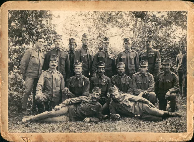 Ez Szántó József katonaképe, mégpedig a fénykép szerint rajta vannak a szakaszvezetők, a tizedesek és a honvédek. A honvédek között szerepel a nagybácsim, Szántó József. A kép jobb oldalán a fekvő személy. Oroszországban kellett legyen, mert cirill betűk vannak a fénykép hátán. Hát a cirill betűket el tudom olvasni, az van ráírva, hogy "fotografia keratibli soran profia, Russia…", Russia a vége. Ez az első világháborúban volt, az biztos, az Osztrák--Magyar hadseregben, és ez orosz földön kellett legyen.