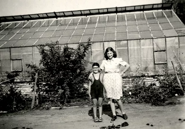 Itt az unokaöcsémmel, Bíró Tamással állok a MIKÉFE-telepen, a legnagyobb üvegház, a szegfűház mellett. Egyébként nemcsak szegfűt neveltek benne. A "hivatalos" neve Klein-ház volt, Klein Gyulánéról, a MIKÉFE alelnökéről nevezték el, aki -- úgy tudom -- annak idején nagy összeggel járult hozzá az üvegház létesítéséhez. Ez ugyanaz az épület és ugyanaz a hely, ahol Tomi egy másik képen látható. Csak közben eltelt három év, sokat romlott a zsidóság és benne a MIKÉFE helyzete. A korábbi képen rózsafasor van az épület mellett, középen látszik a szép ovális medence (ebben lakott Miklós, a teknősbéka). 1942-ben már nem tellett a MIKÉFE-nek a saját kert gondozására.