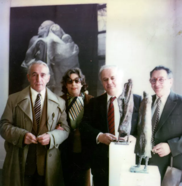 Nem tudom, valószínűleg egy bukaresti kiállítás alkalmával csinálták a képet. Sokat fényképeztek. A háttérben a "Deportáltak emlékműve"-nek nagyított fényképe. Akkor olyan rendesek voltak a minisztériumból, hogy a feleségem is ott volt velem két hétig, szállodában laktunk, s a szövetség fizette még a kosztot is.