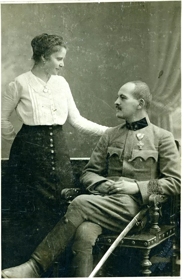 Ez az édesapám, Kádár József és az édesanyám, Ornstein Margit. Apám egyenruhában van, mert ez az első világháború idején készült, amikor összeházasodtak Debrecenben. Rajta van a fényképész neve, Rosmann Géza, és hogy Debrecen. Apámnak több kitüntetése volt. Többek között volt egy ezüst tiszti vitézségi érme, azt hiszem, ez volt a hivatalos neve. Azt nem tudom, hogy miért kapta, de kapta.