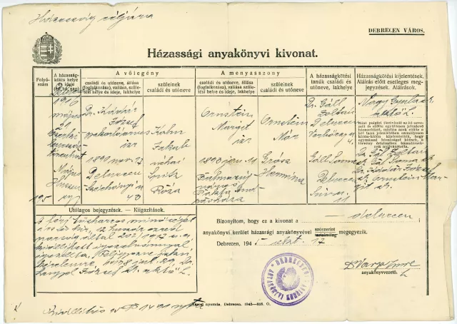 Ez a szüleim házassági anyakönyvi kivonata. 1916. május huszonegyedikén házasodtak. Akkor apám már csapatorvos volt, hazajött szabadságra, akkor kötöttek házasságot.