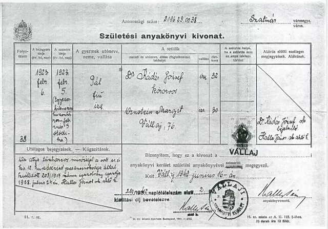 Ez az én születési anyakönyvi kivonatom. 1942-ben állították ki, Vállajon. Érdekes, hogy bele van írva, hogy az atya tűzharcos minőségét a volt császári és királyi huszárezred parancsnoksága által kiállított 203/1917 számú igazolvány igazolja. Ezt is bele kellett írni. Ez nem az eredeti, ez egy másolat, én kértem valami miatt egy másolatot, mert az eredeti az elveszett.