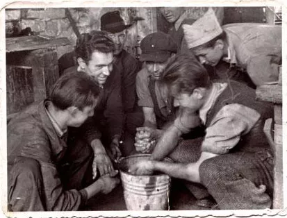 Az inastársaimmal vagyok látható a kolozsvári Vasipari Részvénytársaságnál, 1941-ben. Ez egy munkavégzés utáni pillanatfelvétel. Jól látható, amint munkavégzés után egy vödör vizben kezet mosunk. Abban az időszakban ilyenek voltak a higiéniai körülmények a vasgyárban. Egyik társam nevére sem emlékszám már.