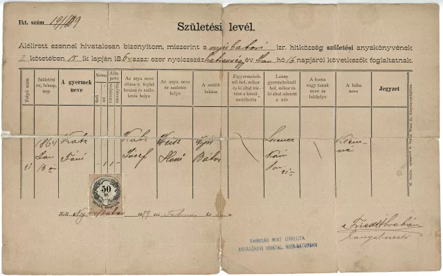 Az anyai nagymamám születési anyakönyvi kivonata. A nyírbátori izraelita hitközség adta ki, 1864-ben.