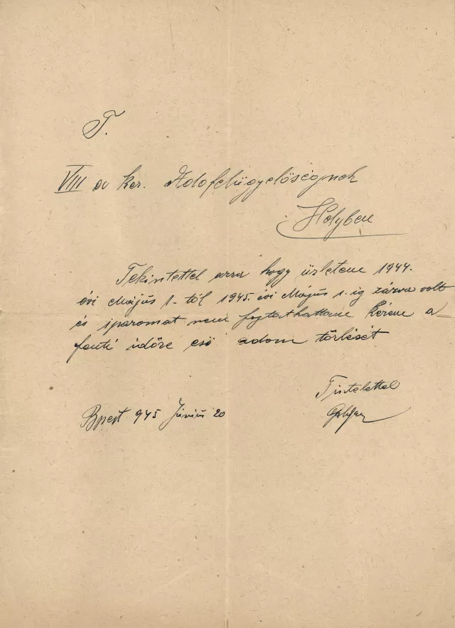 Ezt a levelet 1945-ben írta apám a VIII. kerületi adófelügyelőségnek, melyben kéri, hogy adóját töröljék el. A zsidó törvények értelmében ugyanis 1944-ben bezárták a kocsmáját.