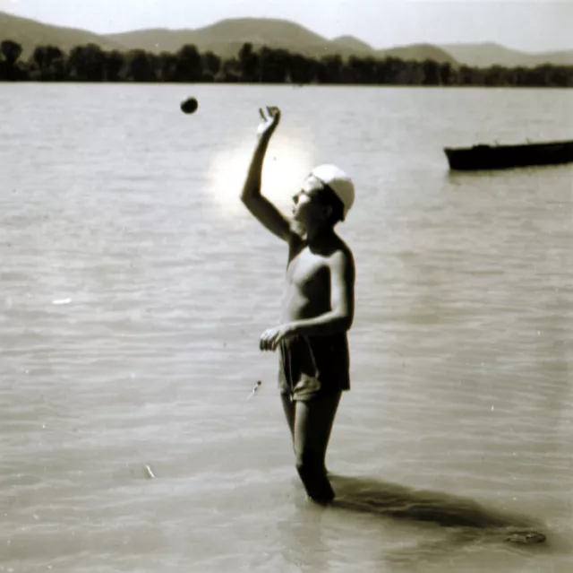 Ez Gábor, Nógrádverőcén. Úgy 1936-ban készülhetett a kép. Apukám csinálta, természetesen. Gyönyörű a háttér, Duna, fasor, hegyek. Emiatt választottuk Nógrádverőcét. Hegy és víz együtt, neki ez volt a nagyon fontos. Beleszerettünk a helybe, hosszú évekig jártunk aztán minden nyáron ide. Nagyon menő társaság volt: Karinthyék jártak oda, Devecseriék. A laza apukám is úgy választotta ezt a helyet, hogy ott hallotta a Centrálban talán, hogy ez egy nagyon jó hely. Aztán tényleg nagyon bevált. Imádtunk kavicsozni a Dunánál. Olyan finom sóderszerű kavicsos part volt.
