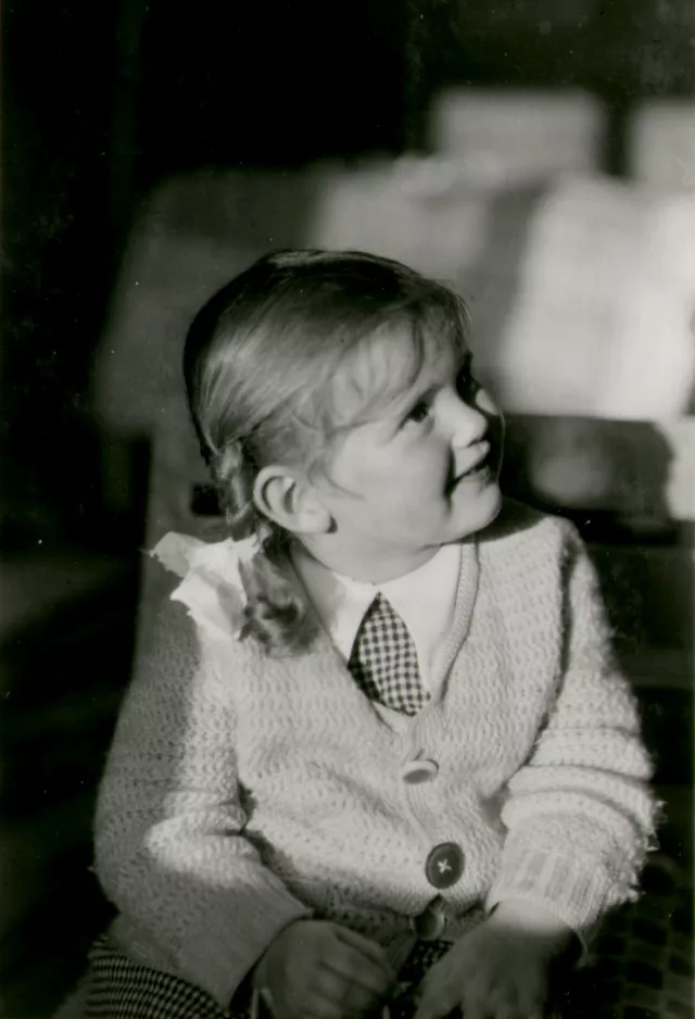 Ez a felvétel, 1937-ben készült, Budapesten. Én vagyok rajta. A kép gyerekszobában készült. Na itt ez a jellegzetes szék, ilyen kicsit art deko-s ez volt az, amit eperszínűre festett anyukám. A nagymamám által kötött kis kabát van rajtam, sokszor le vagyok fényképezve ebbe a kis pepitaruhába fehér gallérral. A Kinszki nagymamám csodálatosan kötött. A bugyimtól kezdve mindent a nagymamám kötött, horgolt. Horgolt bugyim volt, zoknim, nagykabát, korcsolyázáshoz holmik, mackónadrág meg pulóver, kesztyűk, mindent a nagymama kötött.