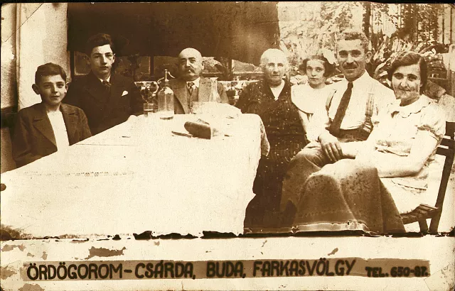 Itt kirándultunk az Ördögorom csárdába. Anyai nagypapám, a Back nagypapa ül középen, mellette a nagymama meg én. Apukám meg az anyukám ülnek a jobb szélen. Az asztal másik oldalán nagyapám mellett pedig anyukám testvérének, a Frida néninek a gyereke, a Zoli és a bátyám. Én körülbelül nyolc éves lehettem, a bátyám tizenkettő. Zoli volt a legidősebb unokatestvérünk ebben a családban. Itt már nagyfiú volt, olyan tizenhat éves.