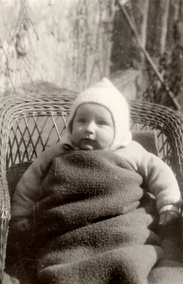Ez a kisebbik fiam, L. Téli kép, február lehetett. Kiültettük a kertbe levegőzni. Ez a takaró még megvan. Nagyon vékony gyapjútakaró. Jó puha. A sapkát én kötöttem neki. Moherből van, nyúlszőrből, az jó meleg. A kép 1954-ben készülhetett a Liszt Ferenc utcai házunk udvarán. A képet valószínűleg a férjem készítette. Azelőtt a férjem sokat fényképezett. Amatőr fotós volt. Egyedül csinálta meg a képeket: előhívattuk, és ő másolta a képeket, meg kicsinyített másolatokat készített róluk.
