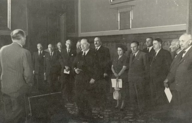 A kép ennek a kitüntetésnek az átadását örökítette meg a Parlamentben. Háttal áll Dinnyés Lajos, vele szemben elöl Stöckler Lajos, a hitközség elnöke, és mögötte a bajuszos az apám. A nő nevére, aki mellette áll, nem emlékszem, de fontos szerepe volt. Ő volt a gettó élelmezési ellátásának a vezetője. A nő másik oldalán Dr. Benedek László kórházi főorvos áll.
