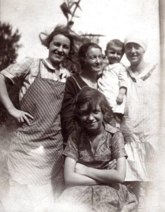 A kép 1927-ben készült Kleinék újpesti házánál. Balról jobbra: anyám, Kauders Istvánné, Singer Mártonné [született Goldstein Antónia], karján az akkor kétéves Klári nővérem, és végül az akkor 16 éves Goldstein Ilonka. Elöl Klein Erzsike ül.