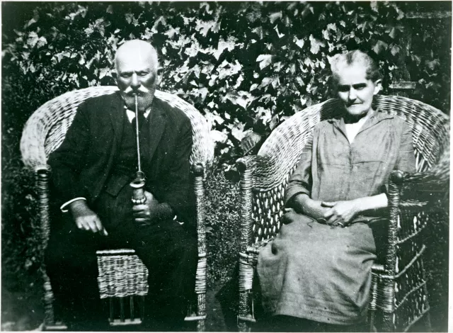 Itt látható az apai nagyapám, Kohn Jakab és a mostohanagyanya, Ornstein Hermina. Ez egy képeslap, a fényképész csinált ilyeneket akkoriban. Ez a pipa jellegzetes egyébként, az Ornstein nagyapának is volt. Mind a kettejüknek volt igazi tajtékpipája [Az igazi tajtékpipa a tajték nevű, magnéziumtartalmú ásványból készült, általában Bécsben, Thüringiában vagy Párizsban. -- A szerk.]. Egész nap pipáztak, mindig a szájukban volt.