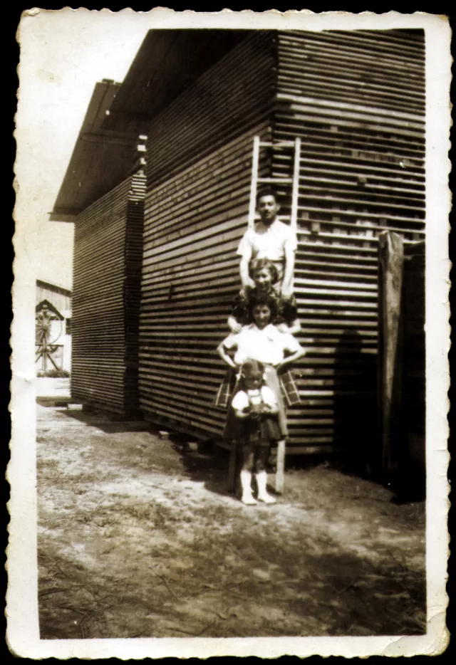 Ez a férjem (legfelül), előtte én, előttem a férjem testvére, a Greiner Dóra, és legelől a kislánya, Ildikó. A kép Cecén készült 1940-ben.