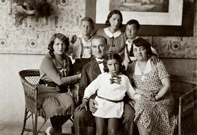 A kép Gyulán készült, 1929-ben a nagyszüleim házában. Az ülő sorban jobbról balra: a nagymamám [Schillinger Lipótné], a nővérem [Steinberger Hanni], a nagypapám [Schillinger Lipót] és anyám nővére [Klara Rosenbach, született Schillinger Klára].