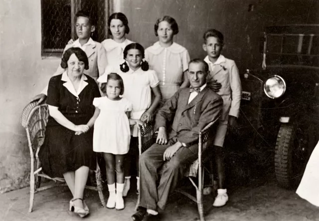 A kép 1933-ban készült, Gyulán. Ülő sorban balról: anyai nagymamám, én, a nővérem, nagypapa. Álló sor balról: Heini (az egyik prágai unokabátyám), anyám, Klári (a prágai nagynéni), Hansi (a másik prágai unokabátyám).