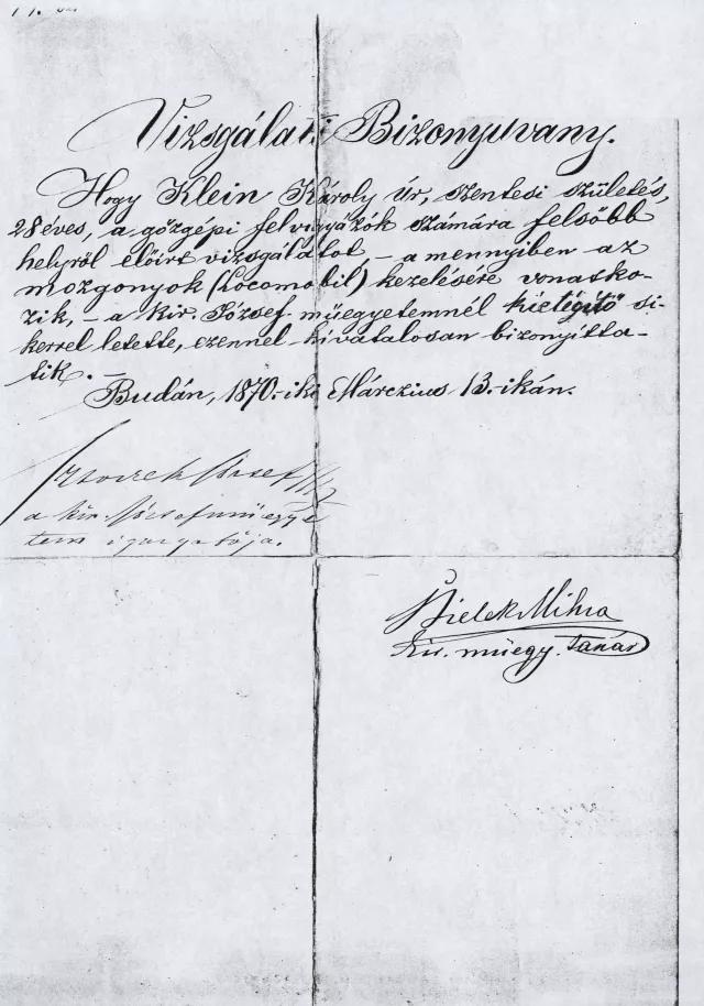 Ez apai nagyapám 1870-ből származó bizonyítványa arról, hogy “kielégítő sikerrel letette” a királyi József Műegyetem “gőzgépi felvigyázók számára felsőbb helyről előírt vizsgálatot”.