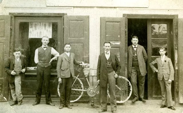 A kép a Kornfeld Áruházat ábrázolja az 1920-as években, az átépítés előtt. Valószínűleg akkoriban kezdték a kerékpár-árusítást is. Érdekesség, hogy a kerékpár fogaskerekén ki volt öntve a Kornfeld név. A képen jobbról a második az édesapám, Kornfeld Ármin. Balról a második, a segéd, egy Ovsanka nevezetű szlovák alkalmazott.
