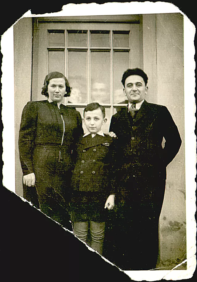 A képen én vagyok a szüleimmel Nagykanizsán, a Tavasz utcai házunk pékségének bejárata előtt. Az üveges ajtó mögött kukucskálók valószínűleg a pékség alkalmazottai: segéd, inas, háziszolga. A kép 1939-ben készült.