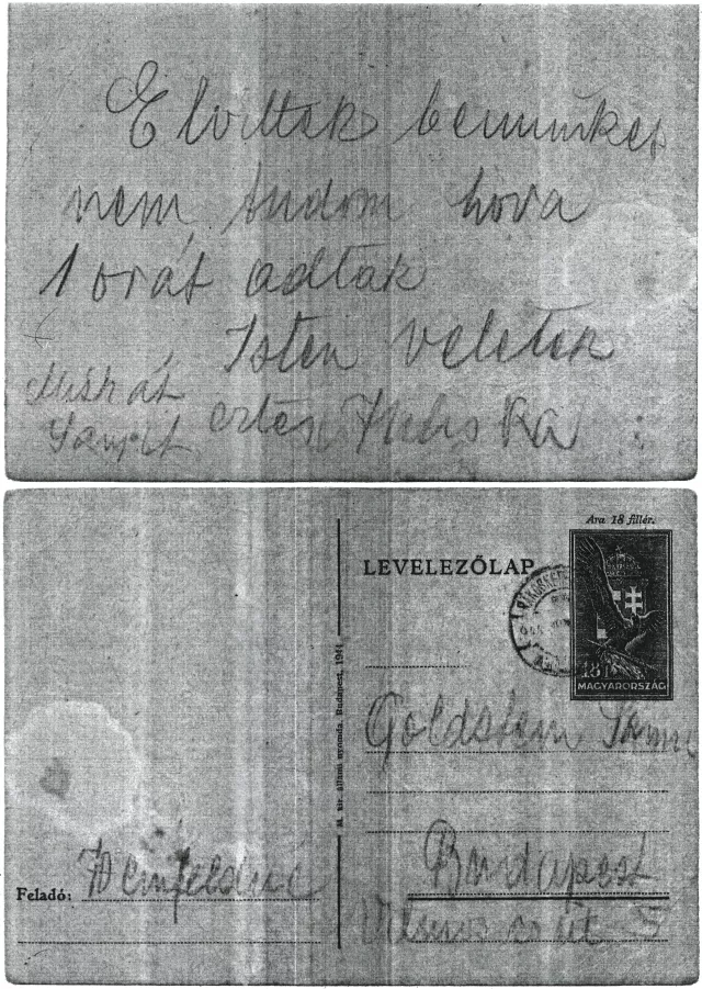 Ezt a levelezőlapot a nagynéném, [Weinfeld Andorné, szül.] Svéd Juliska írta, amikor a nagymamámékat Rákosligetről elvitték Rákoskeresztúrra, a gettóba. Amikor deportálták őket.