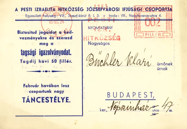 Ezt az értesítőt is a feleségem őrizte meg: A Pesti Izraelita Hitközség Józsefvárosi Ifjúsági Csoportjának nagyságos Büchler Klára úrnő részére küldött értesítője, amely felhívja figyelmét a tagsági igazolvány fontosságára, és egyben jelzi a februári nagy táncestélyt.