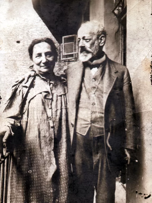 Ezen a képen az anyai nagyszüleim, Lindner Sámuel és Lindner Sámuelné (szül.: Weil Hermina) láthatók. A fénykép 1908-ban készült, Budapesten. Ha jól látom a képen, a házuk gangján készülhetett.