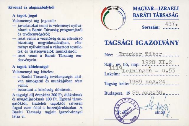 A Magyar--Izraeli Baráti Társaság tagsági igazolványa