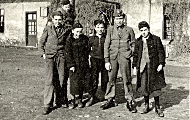 Ez az Újhegyi út 43. Így néztek ki azok a munkáslakások. Itt van az öcsém, Frigyes és a ház többi gyereke. Jobbról az első a Baranyai Pali, aki a pártbizottság elnöke lett a második világháború után. Az édesapja nagyon rendes munkásmozgalmi bácsi volt, ugyanolyan szegénységben éltek, mint mi. A balról a harmadik gyerek 1945-ben tébécében halt meg, volt vagy húsz kiló vagy annyi se. Középen, aki be van jelölve, az az öcsém.